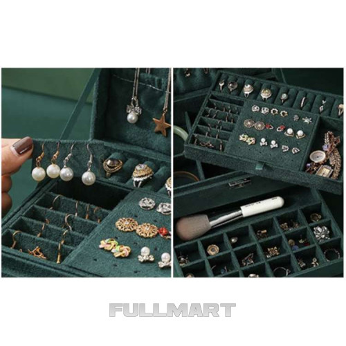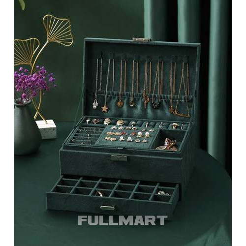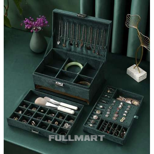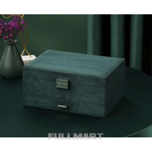 - СПЕЦИФИКАЦИЯ – материал: замша; конструкция: плита МДФ, флизелин; прочее: бумага, картон, пенопласт, нейлон; металлические элементы; цвет: оттенки зеленого; 8 цепных вешалок; 15 слотов для колец; 6 узких отделений; 1 карман на резинке; 18 мест для серег-пусетов; 9 отделений для подвесок; 6 больших отделений; 18 отделений в ящике; 1 продолговатое отделение для часов; размеры закрытого корпуса (длина/ширина/высота): 11,5 х 24,5 х 17,5 см; вес: 0,94 кг. вес упаковки: 1,168 кг.