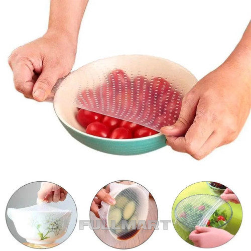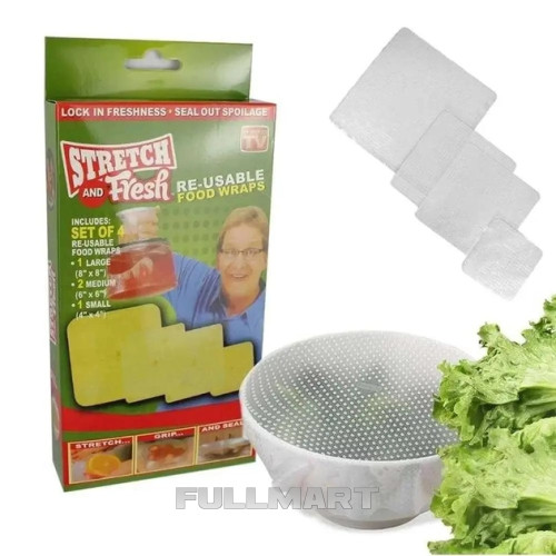 Силиконовые стрейч крышки, которые растягиваются и идеально закрывают любую посуду ( чашки, тарелки, миски, кастрюли) и даже овощи( к примеру арбуз или дыню). Эта крышка-плёнка Stretch and Fresh очень хорошо тянется, за счёт спользования особого пищевого платинового силикона. Она плотно прижимается к краям посуды и создаёт герметичное пространство внутри. Сама она прозрачная и вы легко увидите, что внутри. Теперь вы забудете про фольгу, тонкую плёнку, которая постоянно рвётся. Натянул Stretch and Fresh и полный порядок.