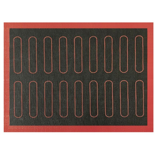 - ДВУСТОРОННИЙ – коврик двусторонний. На одной стороне напечатан рисунок «продолговатого» эклера или бисквита, который облегчает выкладывание теста для печенья. Другая сторона не имеет рисунка.