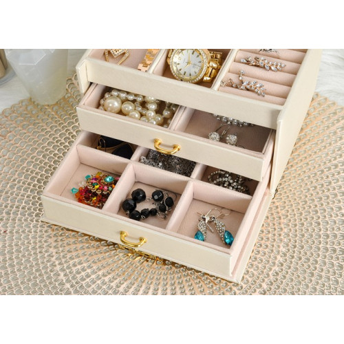 Практична коробка має 20 різних відділень та поглиблень , які допоможуть вам організувати вашу колекцію . Крім відділень, у ящику також є три незалежно висувні ящики. Відділення бувають різних розмірів та ідеально підходять для зберігання годинників, браслетів, ланцюжків, сережок і навіть монет або флешок з важливою інформацією.