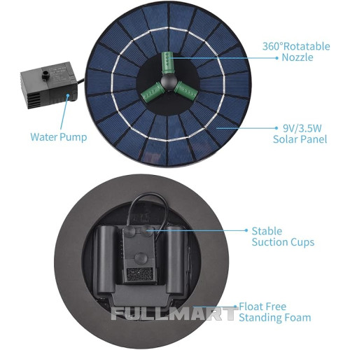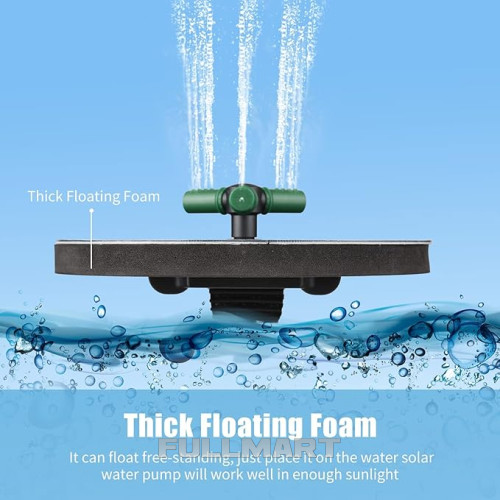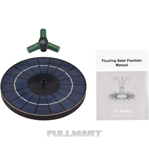 Этот работающий на солнечной энергии фонтан плавает на воде и качает воду за считанные секунды под воздействием солнца (достаточно солнца). Его можно широко использовать в садах, поилках для птиц, небольших прудах, для циркуляции воды для получения кислорода и т. д. Высота распыления воды составляет 50 см, а максимальный расход может достигать 180 л/ч.