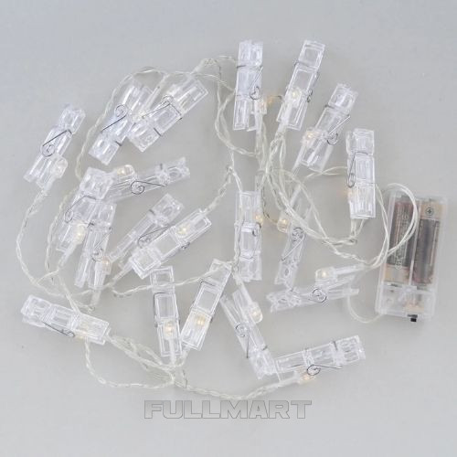 Гирлянда LTL с прищепками для фото 10-20 led Warm White длина 3 метра на батарейках 2 шт AAA Гирлянда исполнена в виде акриловых прищепок, в торце которых установлены яркие белые светодиоды. Гирлянда имеет автономное питание (2 батарейки типа АА), что позволит использовать ее не только дома, вблизи розетки, а и во дворе, на веранде, на елке, и вообще в любом месте, где Вам захочется ее повесить. Одна гирлянда имеет 20 прищепок со светодиодами. Развесив на них фотографии, рисунки или прочие элементы декора - Вы создадите неповторимую атмосферу на любом празднике, будь до День Рождения, свадьба или просто семейное мероприятие.
