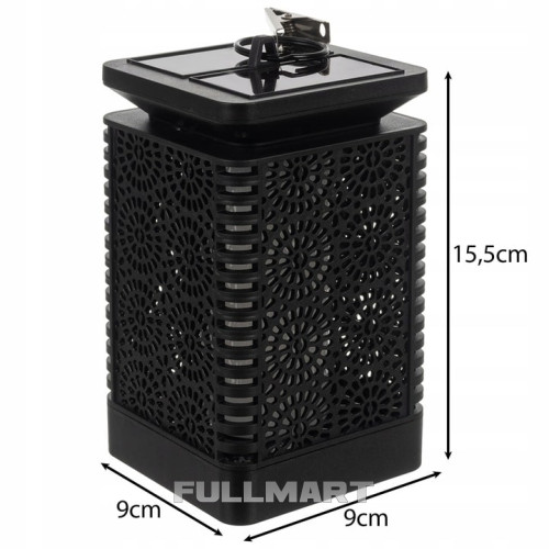 ТЕХНИЧЕСКИЕ ХАРАКТЕРИСТИКИ – цвет: черный; цвет свечения: теплый белый (имитация пламени); материал: ABS, железо; датчик сумерек: ДА; аккумулятор: 3.7V 600mAh; источник света: SMD LED; мощность: 1,2 Вт; светоотдача: 30 лм; угол луча: 360°; водонепроницаемость: IP44; время зарядки: 6-8 часов; время работы: 8 час; размеры: 15,5 х 9 х 9 см; вес: 0,2 кг; вес в упаковке: 0,3кг.