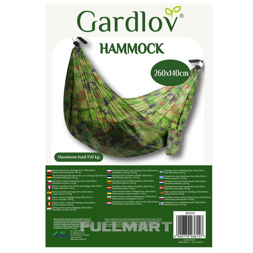 - СПЕЦИФИКАЦИЯ - цвет: камуфляж; материал: нейлон, остальные: железо) + 2 карабина (оцинковка) + 2 веревки (нейлон); максимальная нагрузка: 150 кг; размеры (длина/ширина): 260/140 см; общие размеры: 280 см; вес: 0,65 кг; вес в упаковке: 0,65 кг.
