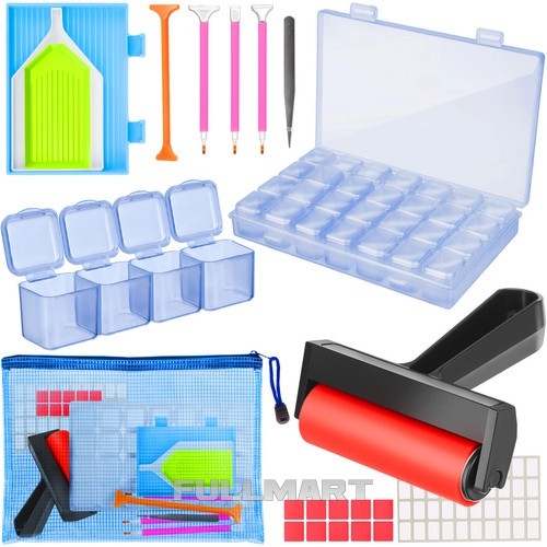 - МНОГИЕ ПРЕДМЕТЫ ВКЛЮЧЕНЫ – в набор для алмазной вышивки входит множество элементов, которые сделают наклеивание картинок из алмазов намного удобнее и практичнее. В комплект входят такие аксессуары, как 4 «ручки», органайзер для бриллиантов, валик для прижима, пинцет, клей, сумка для инструментов, 3 кюветы и наклейки для описания бриллиантов на органайзере .