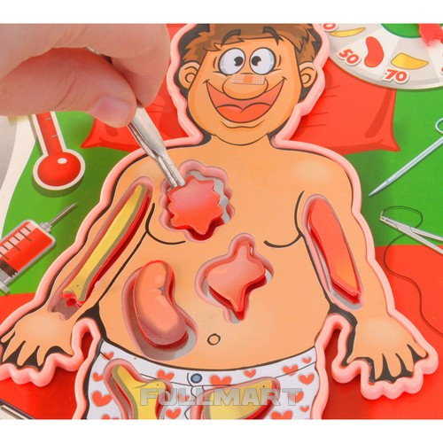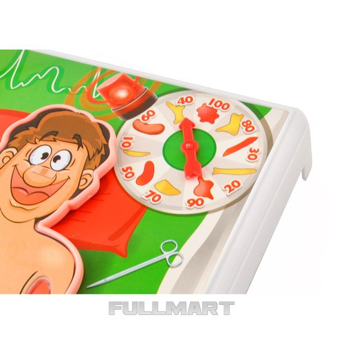 Операционная игра учит терпению и концентрации. Каждый игрок должен с помощью щипцов вытащить часть тела, указанную колесом фортуны, которое было положено на кровать пациента. Нельзя касаться края, иначе пациент «задрожит», и вы потеряете ход.