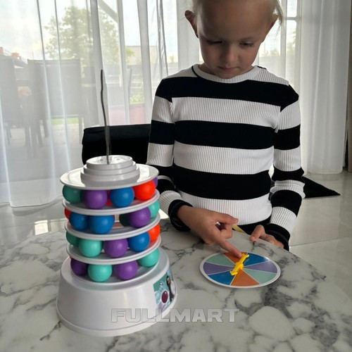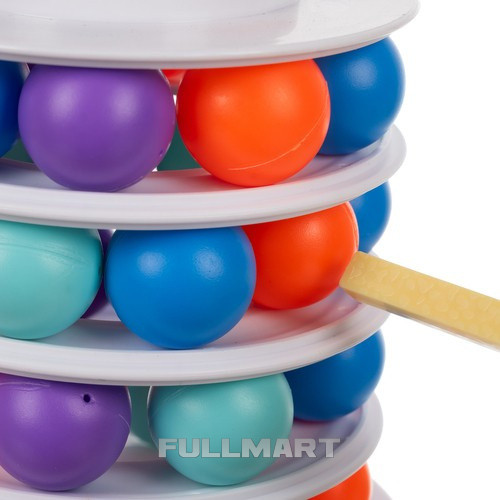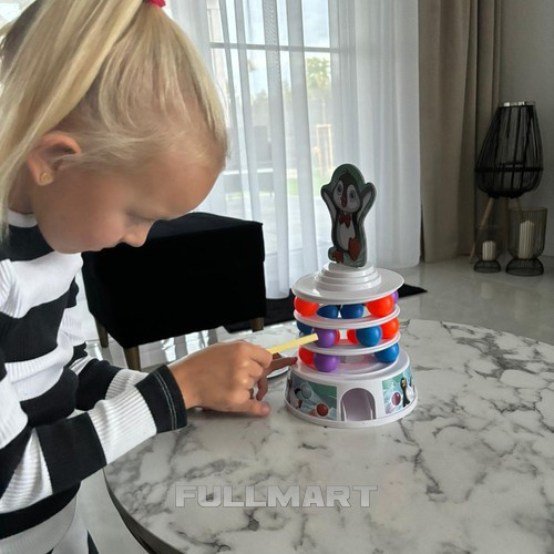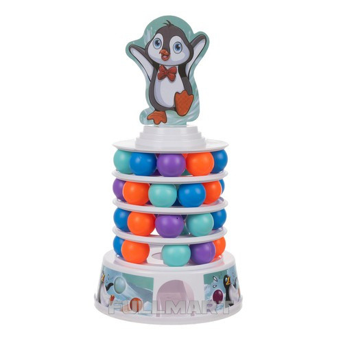 - КАК ЭТО РАБОТАЕТ - игра о строительстве башни – на каждом уровне установить следующее Размещаем на шарах 9 шариков разного цвета. обруч, и на самом верху размещаем его купол башни с изображением пингвина . Затем Убираем шарики с разных уровней башни с помощью палочек. таким образом, чтобы не разрушить всю конструкцию. Каждый игрок вращает рулетку, чтобы выбрать цвет шарика, который он должен удалить. Шары после удара они падают внутрь башни и вылетают через дыру в основании . Задача игроков – убрать их так, чтобы башня не упала и пингвин остался на вершине. По мере прохождения игра становится все более захватывающей и сложной. удаление большего количества шаров k, что снижает устойчивость башни .
