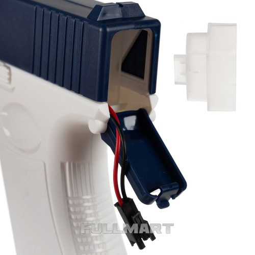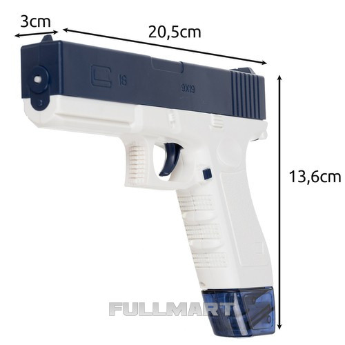 - ТЕХНИЧЕСКИЕ ХАРАКТЕРИСТИКИ - цвет: сине-белый; материал: АБС; выстрел: безопасная водометная струя; зарядка: через USB; емкость большого магазина: 400 мл, емкость маленького магазина: 40 мл, размеры: 20,5 х 3 х 13,6 см; вес: 0,3 кг; вес в упаковке: 0,47 кг.