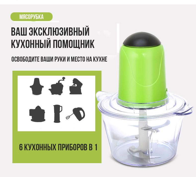 Замінює 6 приладів: міксер, шейкер, м'ясорубку, блендер, овочерізку, кавомолку.