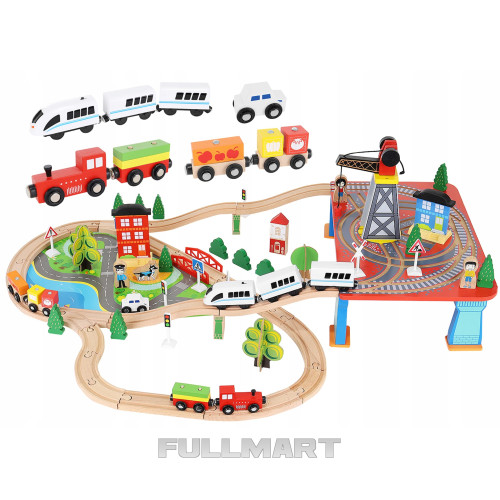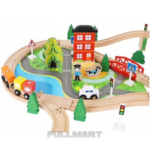 Дерев'яний поїзд - чудова ідея для розвитку уяви та творчих здібностей вашої дитини. Підходить для ігор вдома та на вулиці. Набір складається з 88 ретельно виготовлених та красиво оброблених елементів, які можна компонувати на свій розсуд. У комплект входять, серед іншого, траса, вантажний поїзд, пасажирський поїзд, автомобіль, набір дерев та дорожніх знаків, 3 фігурки та поліцейський собака, перевалочний порт з краном та дошка, що імітує дорогу для машина.