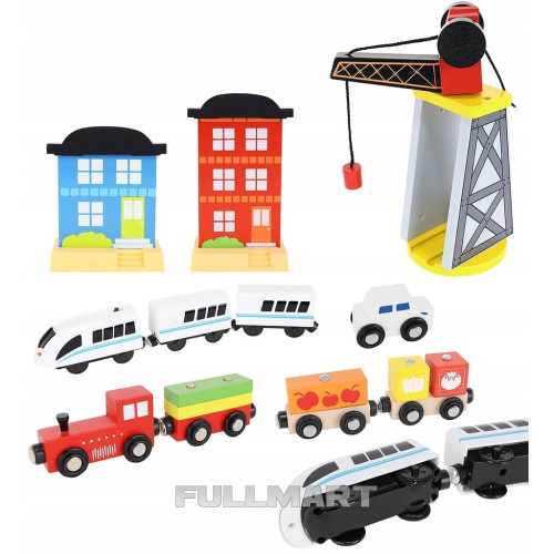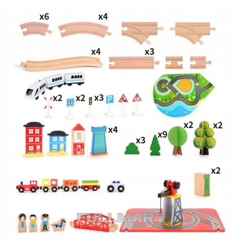 - 88 ЕЛЕМЕНТІВ- набір складається з 88 ретельно виготовлених та красиво оброблених елементів , які можна компонувати на свій розсуд . У комплект входять, серед іншого, шлях, вантажний поїзд, пасажирський поїзд, автомобіль, набір дерев та знаків, 3 фігурки та поліцейський собака, перевалочний порт з краном та дошка з дорогою. Елементи паровозика та паровозика з'єднуються за допомогою магнітів – тут немає непотрібних гачків, які могли б відламатися та викликати постійні проблеми у дитини при від'єднанні набору. Магніти сильні – не відпускають, навіть коли весь комплект піднятий.