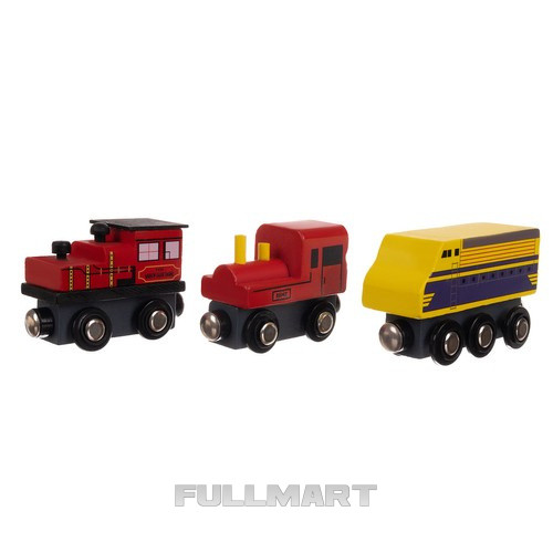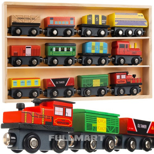 - СПЕЦИФИКАЦИЯ — материал: дерево, остальные: железо + ПЭ + магнит; 3 локомотива; 9 вагонов; органайзер/полка в комплекте; размеры всего набора с органайзером: 33 х 20 х 3 см; вес очереди 0,662 кг; вес в упаковке: 0,974 кг.