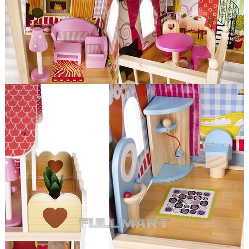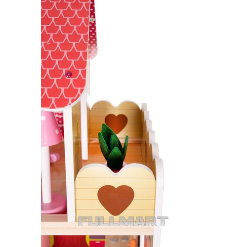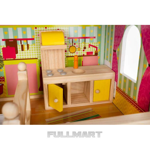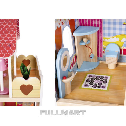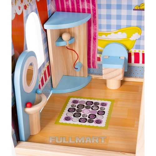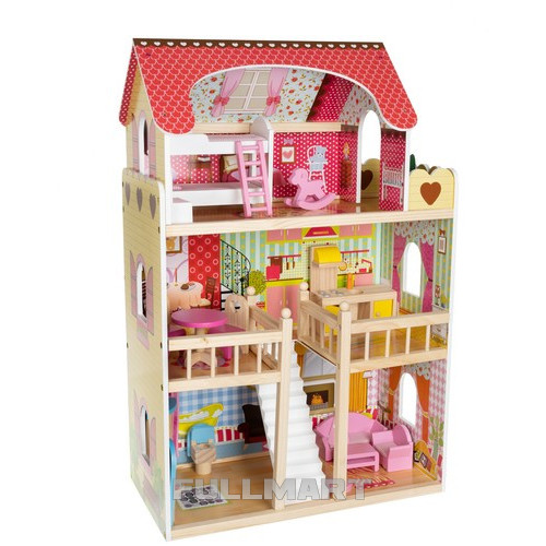 - ТЕХНИЧЕСКИЕ ХАРАКТЕРИСТИКИ – цвет: многоцветный; материал: дерево; количество элементов в наборе: 15 + домик; размеры (длина/ширина/высота): 29/59/90см; количество уровней: 3; количество комнат: 5 + балкон; вес: 10 кг; вес в упаковке: 11,25 кг.