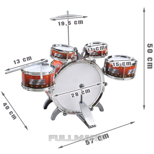 - ТЕХНИЧЕСКИЕ ХАРАКТЕРИСТИКИ - материал: 5 шт барабаны (АБС) + 3 шт. палочки для еды (АБС) + тарелка (нержавеющая сталь + АБС) + табурет (АБС) + педаль (АБС + нержавеющая сталь) ; размеры: 57 х 40 х 50 см; вес: 1,5 кг.