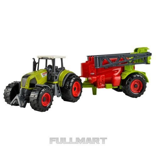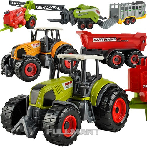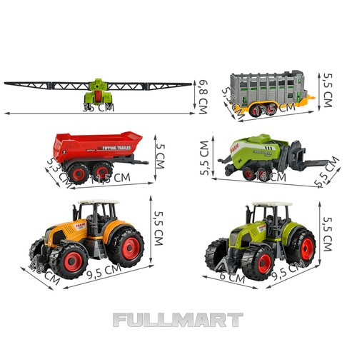 - СПЕЦИФІКАЦІЯ - матеріал: АБС, інші: алюмінієвий сплав; розміри зеленого трактора: 9,5 х 6 х 5,5 см; розміри помаранчевого трактора: 9,5 х 5,8 х 5,5 см; розміри причепа для перевезення тварин: 13,5 х 5,5 х 5,5 см; розміри самоскида: 11,5 х 5,3 х 5 см; розміри розпилювача: 35 х 6,8 см; розміри преса: 14 х 5,5 х 5,5 см; вага комплекту: 0,36 кг; вага із упаковкою: 0,456 кг.