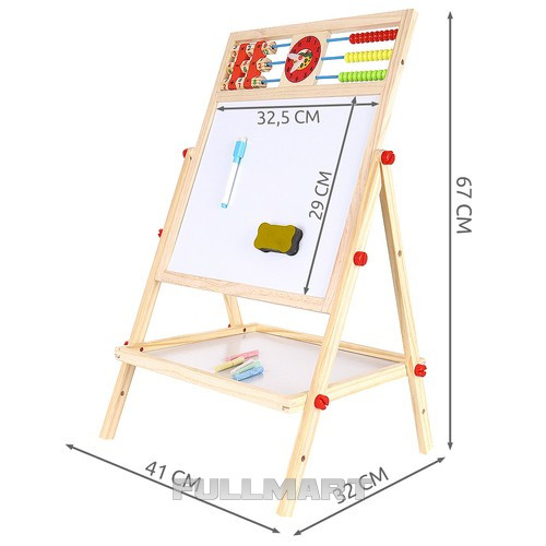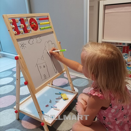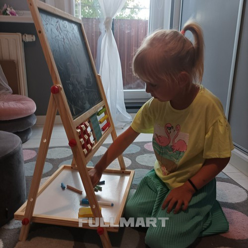 1 ДОШКА = 6 ФУНКЦІЙ - двостороння дошка має цілих 6 різних застосувань. Це дозволяє малюку малювати крейдою на чорній стороні дошки і маркером на білій стороні. На дошці також є класичні рахунки з намистинами , за допомогою яких дитина почне свою пригоду з рахунком. Потім вони зможуть вивчити основні математичні операції , такі як додавання, віднімання та множення. У дитини також буде годинник , на якому він зможе вільно встановлювати час за допомогою стрілок; навчіться дізнаватися час. Також на дошці є алфавіт , який дозволить дитині познайомитися з першими літерами, що надалі дозволить їй скласти свої перші слова.