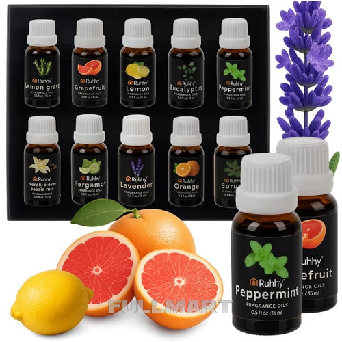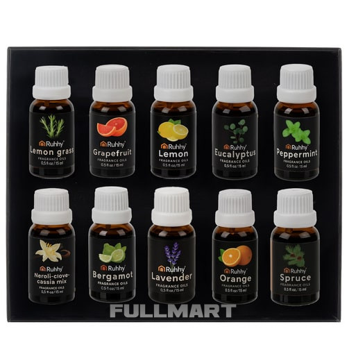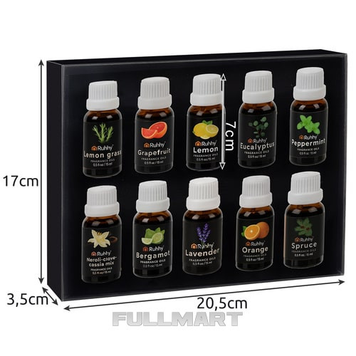 - 10 РІЗНИХ АРОМАТІВ – весь набір має 10 різних ароматів, таких як: евкаліпт, апельсин, м'ята, лаванда, сосна, лимон, водяна лілія, грейпфрут, лемонграс, бергамот. Усі масла упаковані у флакони ємністю 15 мл кожен .