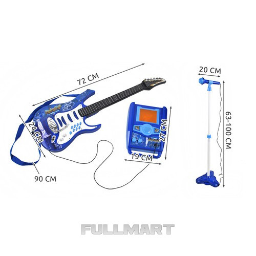 - СПЕЦИФИКАЦИЯ - цвет: синий; питание гитары: 3 батарейки типа АА (в комплект не входят); Питание усилителя: 3 батарейки типа АА (в комплект не входят); длина ремешка: 90 см; размеры блока питания: 27 х 19 см; высота микрофона: 63 – 100 см; размеры гитары: 72 х 24 см; вес: 1,55 кг; вес в упаковке: 1,8 кг.