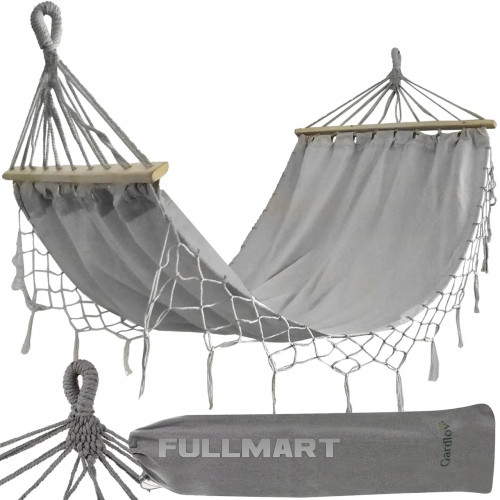 СПЕЦИФІКАЦІЯ - колір: сірий; матеріал: бавовна, поліестер; максимальне навантаження: 200 кг; довжина дерев'яної рами: 80 см; розміри матеріалу (довжина/ширина): 200 х 100 см; загальна довжина: 270 см; вага: 1,4 кг; вага в упаковці: 1,6 кг.