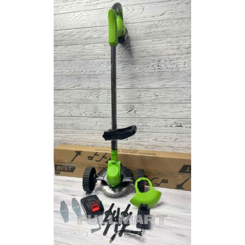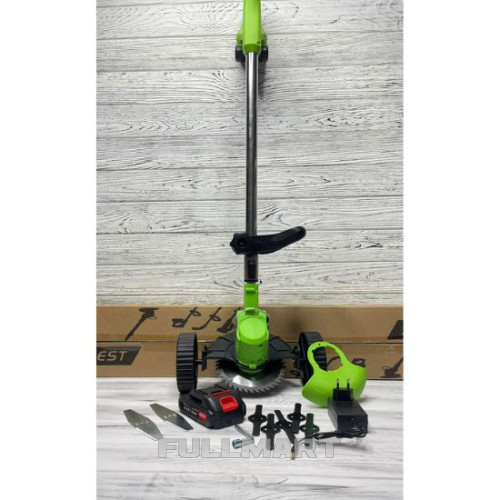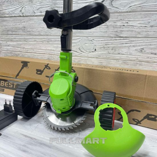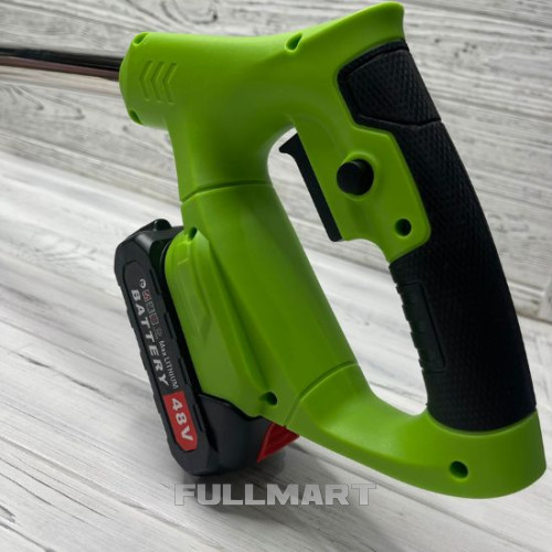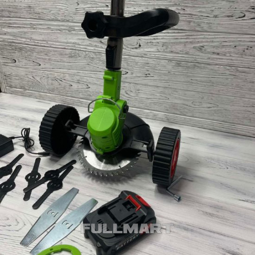 Акумуляторна бездротова косарка/триммер для трави та кущів. Бездротова газонокосарка/триммер, що працює на Li-Ion 48V акумуляторі, оптимальна для роботи на дачній, присадибній ділянці. Також для швидкого та зручного очищення місцевості від трави та кущів. Це великий професійний інструмент для постійної роботи. Завдяки спеціальній конструкції триммер має змінні колеса, що полегшить роботу на ділянках з невисокою травою, де потрібний рівномірний покіс. Тример також можна використовувати в класичному виконанні без коліс.