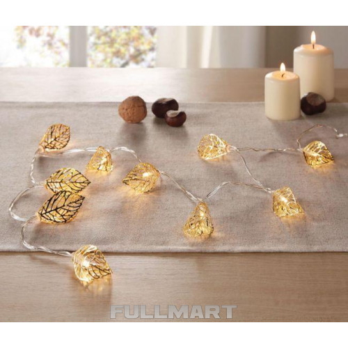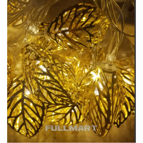 Світлодіодна гірлянда з насадкою «Золоте листя» завдовжки 3,6 метра, на якій розміщено 20 золотих листків. Провід прозорий і при увімкненому положенні майже непомітний. Гірлянда має один режим свічення. Працює від мережі 220 Ст.