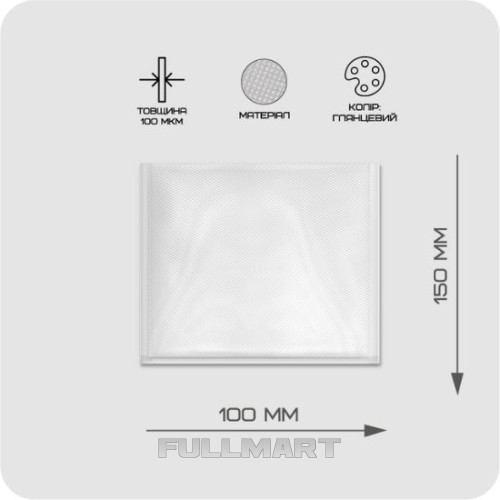 Пакети рифлені для вакуумного пакування, прозорі в пачках по 100 штук, розміри 10 на 15 см. Кожна плівка пакета виготовлена з 5 шарів. Товщина рифленої сторони 85 мкм, товщина гладкої - 90 мкм. Температурний режим використання -40С до +100С.