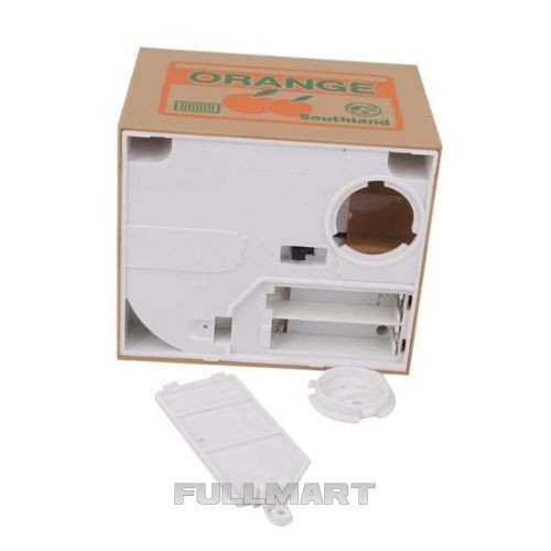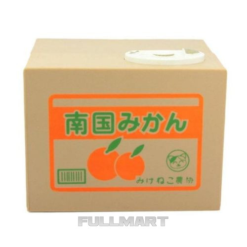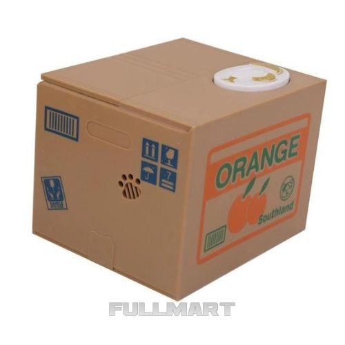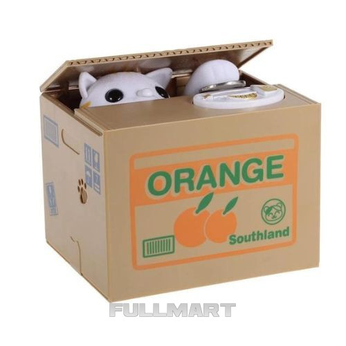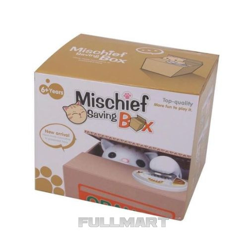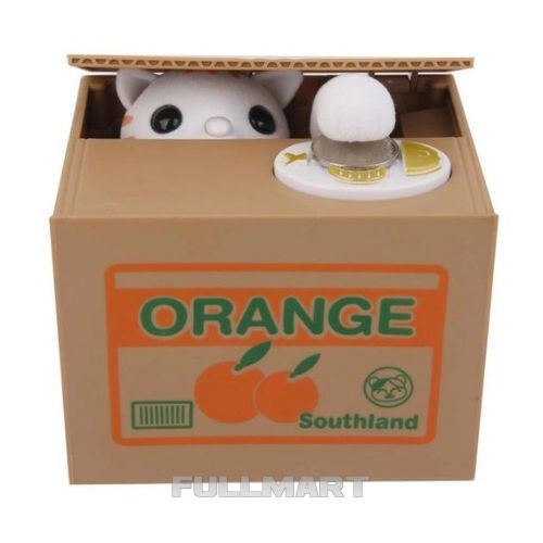 Скарбничка виконана у вигляді котика, що сидить у картонній коробці. Зверху лежить миска, як тільки Ви кладете на тарілку монетку, з коробки лунає звук тварини і з'являється хитра мордочка, і лапка, яка забирає монету. Внизу є отвір, який закривається кришкою, завдяки якому монетки можна діставати.