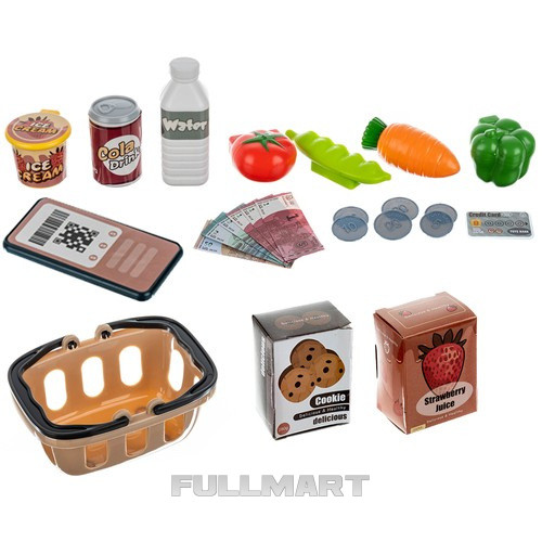 - Количество товаров для покупки: 9 (фасоль, морковь, перец, помидоры, мороженое, кола, вода, пакет сока, коробка печенья)