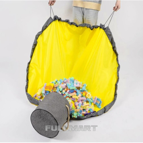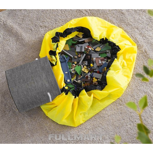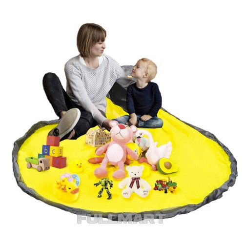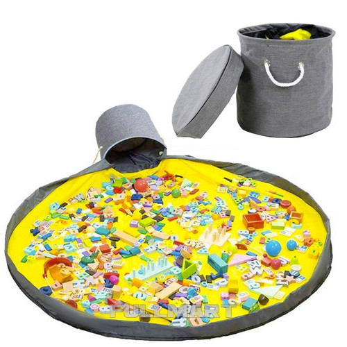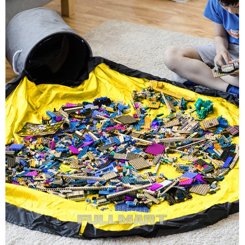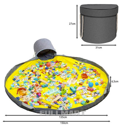 - 2 в 1 – продукт выполняет две функции. Это блестящее решение для хранения и быстрой чистки кубиков и игрушек . Однако коврик также используется для игры. Он большой, 135 см в диаметре. Это значительно упрощает выгрузку и сбор игрушек. Дополнительно к коврику вшит шнурок со стопором, который при снятии превращает его в мешочек.