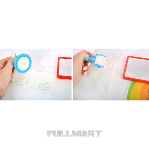 СПЕЦИФИКАЦИЯ – материал: 6 штампов (ПС + пена ЭВА) + 6 трафаретов (ПП + пена ЭВА) + 4 маркера (ПП) + 4 сменных шаблона штампов (ПП + пена ЭВА) + 2 кисточки (ПП) + 2 емкости для воды (ПП) ) + 1 штемпельный элемент (ПП) + 1 штамповочный валик (ПП + пена ЭВА) + 1 чехол (ПП); размеры коврика: 100 х 80 см; вес: 0,579 кг; вес в упаковке: 0,871 кг.
