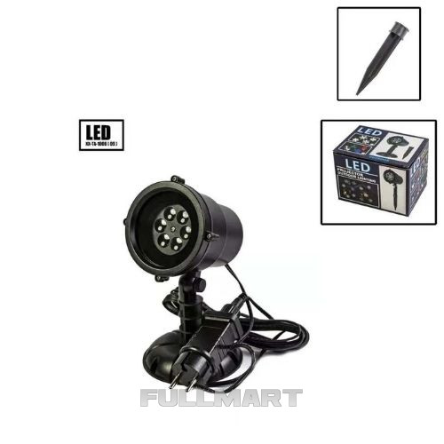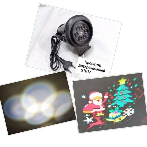 Лазерний проектор вуличний новорічний, його зображення це: красиві великі різнокольорові дзвіночки, Дід Мороз, Олень та подарункова шапочка мішок. Кольору; червоний, синій, зелений, білий, завдяки диску, що постійно крутиться, фігурки переміщаються в автоматичному режимі по вибраному рельєфу, і одна фігура знаходить на іншу, в ту ж мить з крайніх точок з'являються нові малюнки які прагнуть на зустріч один до одного, фігурки-малюнки добре промальовані та реалістичні. Пристрій можна закріпити на стіні в приміщенні, так само завдяки спеціальній шпильці, що знімається, можна встановити на вулиці в грунт для лазерного диско шоу або освітлення фасаду будинку в нічний час.