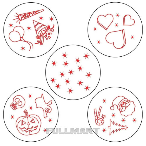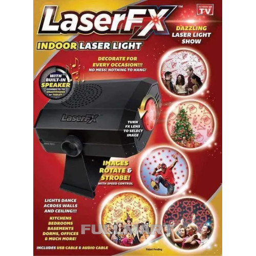Лазерний проектор Laser FX має 5 встановлених тематичних зображень на основні свята: Різдво/Новий рік, Хелловін, День Народження, День Святого Валентина.