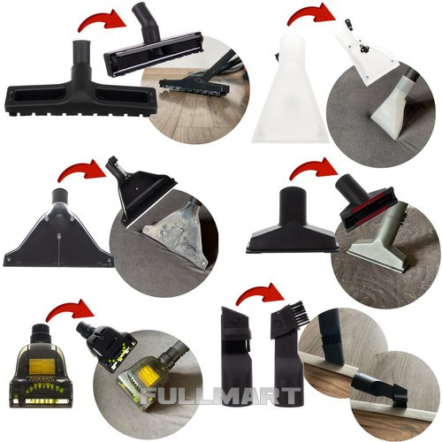 - КАК РАБОТАЕТ ПЫЛЕСОС? - имеет систему из двух баков. Налейте в один из них воду и чистящее средство, а в другой автоматически наполнится использованная и грязная вода. Емкость бака для моющего средства составляет 3,5 литра, а емкость для грязной воды после стирки — 20 литров. В наборе 6 насадок! Совет по уборке пола в режиме турбо предназначен для чистки гладких поверхностей и ковров, удаляет стойкие загрязнения, например, шерсть животных, благодаря вращающемуся валику с синтетическими собирающими элементами. Узкая насадка с подвижным наконечником он идеально подходит, например, для чистки углов диванов, плинтусов, потолков и других укромных уголков. Маленький Т-образный наконечник. Идеально подходит для чистки ковров, ковриков и обивки. Чистящая насадка с водяным распылителем, распылительный наконечник и щетка для пола.