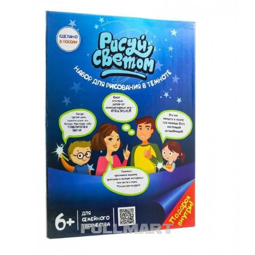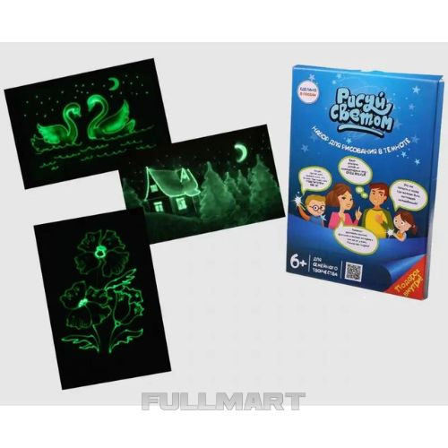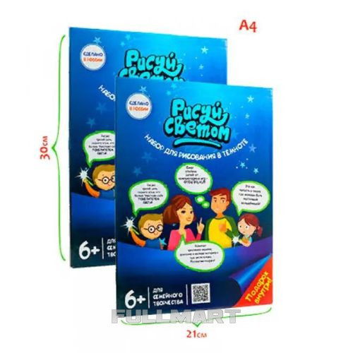 Основа набору це планшет Рисуй Світлом з покриттям, що накопичує світло і ручка-ліхтарик. Дістаньте планшет із світлонепроникного чохла, торкніться маркером до планшета, одночасно утримуючи кнопку на маркері, і починайте малювати.