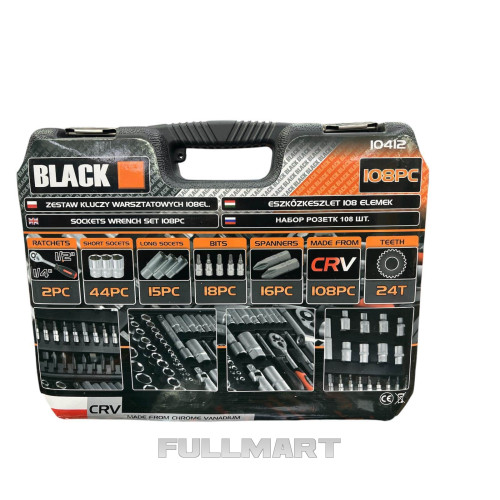 Набір ключів BLACK ручний інструмент, призначений для роботи вдома, на СТО, автомайстернях, автосервісах, виробництві. У наборі 108 одиниць оптимально підібрано всі ключі для виконання різних робіт. Інструменти виготовлені з хрому ванадієвої сталі.