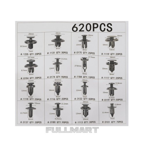 - СПЕЦИФИКАЦИЯ: материал: ПП, АБС, железо; марка автомобиля: универсал; применение: универсальное; количество пинов: 620 шт.; количество типов пинов: 16; размеры корпуса: 16,5 х 16,5 х 12,5 см; вес: 0,82 кг; вес в упаковке: 0,92 кг Комплектация: запонок 620 шт.; 4 шт; инструмент для снятия клипс 1 шт; чехол 1 шт.