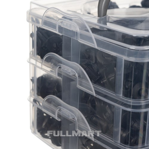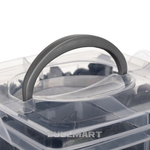 - Практичная пластиковая коробка Набор автомобильных зажимов помещен в удобный кейс. пластиковый ящик, также изготовленный из полипропилена , который облегчает организацию и хранение булавки . Коробка состоит из три уровня, соединенные прочным замком , что обеспечивает безопасное хранение элементов. На каждом уровне бокса имеются отсеки, разделяющие зажимы разных типов и размеров , что обеспечивает быстрый и удобный доступ к нужным во время работы зажимам. Есть один в верхней части коробки. удобная ручка , облегчающая переноску набора.