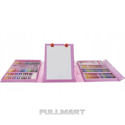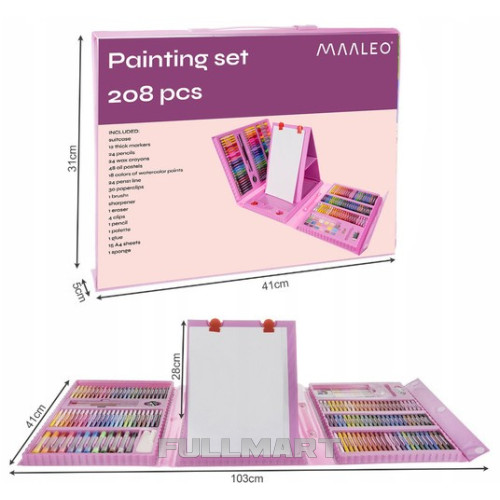 - G ГИГАНТСКИЙ НАБОР — набор для рисования в чемодане целых 208 элементов , в том числе: чемодан с 12 толстыми маркерами, 24 карандашными мелками, 24 восковыми мелками, 48 масляными пастелями, 18 цветов акварельных красок, 24 маркера, 1 линейка, 35 скрепок, 1 кисть, 1 точилка , ластик, 4 скрепки, 1 карандаш, 1 палитра, 10 листов А4, 1 губка.