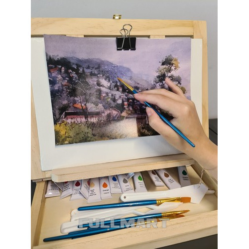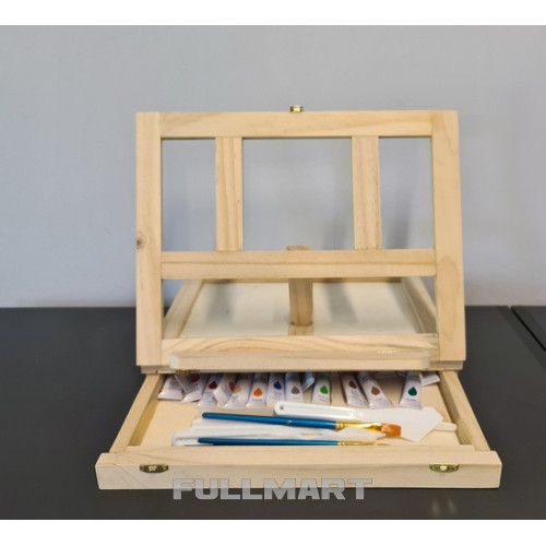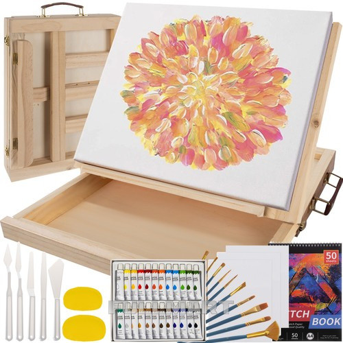 В наш набор для рисования из 46 предметов входят: Изготовлена из акриловых красок разных цветов, кистей и палитры для живописи, компактно спрятанной в деревянный чемодан, который при открытии превращается в удобный мольберт. Поставьте альбом для рисования на мольберт и дайте волю своему воображению! Хотите сначала сделать эскиз, чтобы точно, шаг за шагом, создать свою работу? В этот набор входят все принадлежности для рисования, которые могут понадобиться вам в творческой работе.