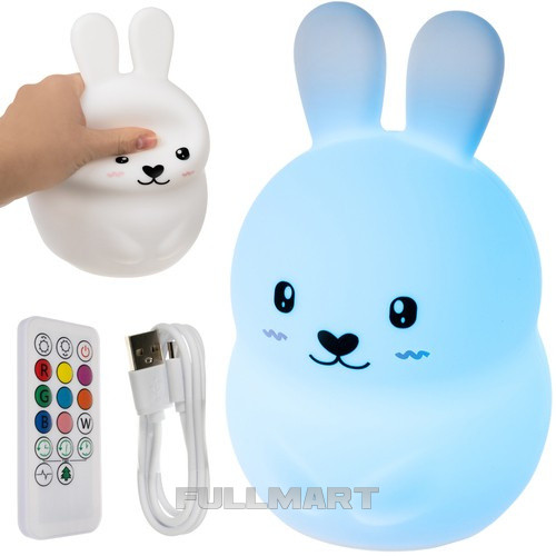 - СПЕЦИФИКАЦИЯ - цвет: белый; материал: силикон, другие: АБС + пульт дистанционного управления: материал: АБС, другие: ПЭТ; количество цветов освещения: 9; количество режимов яркости: 10; функция перехода цвета: да; функция перехода цвета: да; таймер: 15, 30 или 60 минут, зарядка: 4 часа; источник питания: литиевая батарея емкостью 1200 мАч; зарядка: через USB-кабель; тип освещения: светодиодный; мощность: 0,5 Вт; длина кабеля: 75 см; размеры кролика (длина/ширина/высота): 18/11/11см; вес: 0,15 кг; вес набора с упаковкой: 0,33 кг.