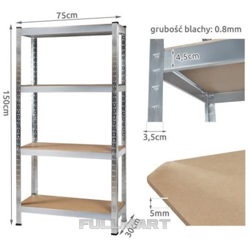 - СПЕЦИФИКАЦИЯ - размеры полки (высота/ширина/глубина): 150/75/30см; размеры полки (ширина/длина): 74,3/29,3см; макс. нагрузка на полку: 135 кг (всего 540 кг на всю полку); количество полок: 4; материалы: оцинкованная сталь 0,8мм, плита МДФ 4мм; монтаж: безвинтовой (вставные перекладины); вес: ~11кг.