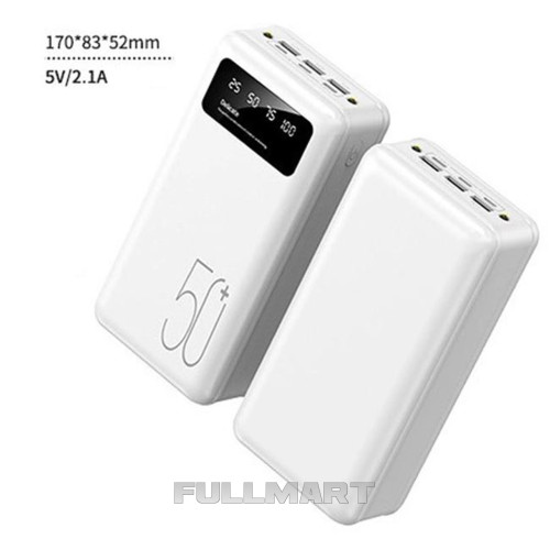Power Bank 50000 mAh – зовнішній акумулятор, який не підведе у дорозі. У ньому зосереджено велику ємність 50000 мАг. Такого запасу енергії вистачить у середньому на 6–8 повних зарядів смартфона. На торці розташований подвійний світлодіодний ліхтар, який можна використовувати як запасне джерело світла під час кемпінгу або як настільна лампа. З його допомогою ви зможете заряджати три пристрої одночасно. Сам повербанк заряджається будь-яким кабелем: USB-Type-C, Lightning або micro-USB.