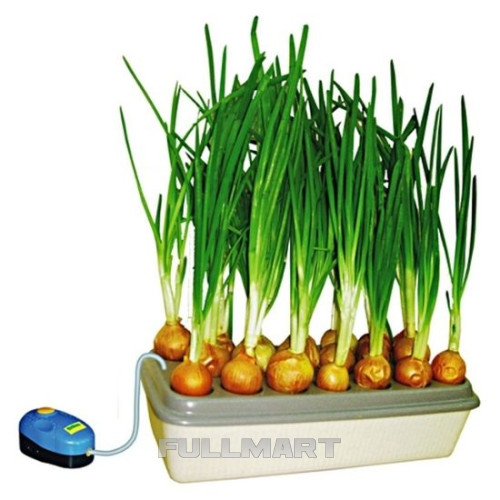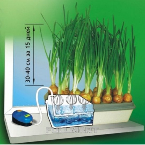 На майданчику посадкових місць розміщується 20 середніх цибулин (40-50 г кожна). У ємність наливається звичайна вода (наприклад, з водопроводу), не досягаючи 1-2 см до краю ємності. В установці "Цибулеве щастя" використовується система повітряного живлення коріння, за допомогою якої відбувається активне нагнітання дрібних бульбашок повітря у воду. При досягненні поверхні води бульбашки лопаються, створюючи тим самим дрібнодисперсійну зависну воду в повітрі - ефект "водяної лазні" між поверхнею води та донцями цибулин. За рахунок створення даного повітряно-водного середовища корені рослин дуже швидко досягають води і швидко збільшуються в довжину. і для тих, хто просто любить додавати зелену цибулю до приготованих страв.