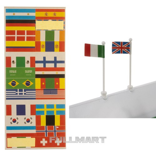- АКСЕСУАРИ У КОМПЛЕКТІ — окрім настільного футболу, в комплект входять необхідні аксесуари для проведення справжнього матчу, такі як: ворота, м'яч, прапори та наклейки з прапорами країн, а також табло.