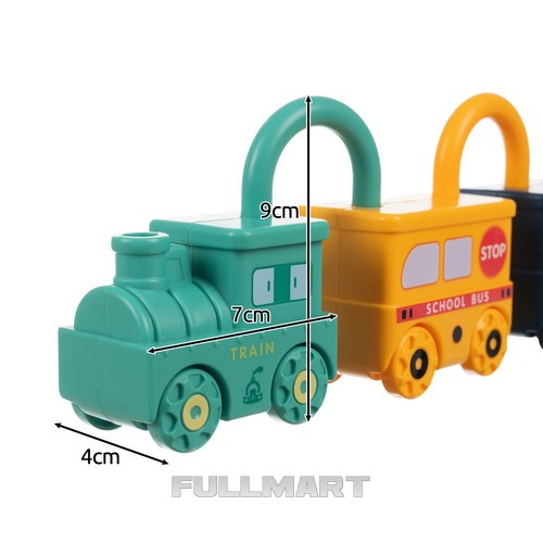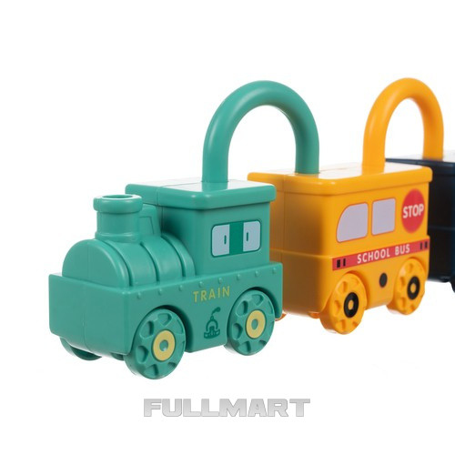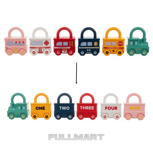 - НАБОР С 6 РАЗЛИЧНЫМИ МАШИНАМИ - пазл с машинками представляет собой набор, состоящий из шесть разных транспортных средств: локомотив и пять вагонов в виде прямоугольных навесных замков. Локомотив с пометкой «Поезд» , имеет надпись на одной стороне. «Ноль» , и каждое последующее транспортное средство представляет собой цифры от 1 до 5 и Английские названия : «Школьный автобус», «Полиция», «Пожарная машина», «Скорая помощь» и «Мороженое». Благодаря этому набор не только развивает воображение , но и помогает детям познакомиться с числами и английским языком . Снизу В игрушечных машинках есть отверстия для ключа после его поворота замок открывается – игрушечная машинка. Верхняя, съемная часть можно вращать на 360 ° .