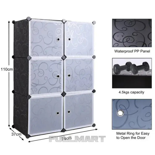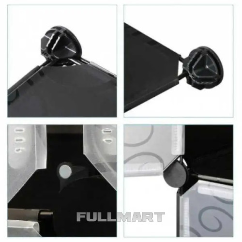 Модульна шафа - чудове рішення для одягу, взуття, іграшок та інших аксесуарів. Шафа виготовлена з поліпропіленових пластин, посилених металевим каркасом та сполучними елементами з ABS. Стінки шафи з'єднуються за допомогою передбачених куточків. Завдяки магнітам двері відмінно зачиняються.