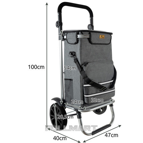 - СПЕЦИФИКАЦИЯ – материал: полиэстер, пена EPE, алюминиевая фольга, алюминий, железо, пенопласт, ПП, ПЭ, нейлон; цвет: серый; водонепроницаемость: да; двухсторонний закрытый подшипник; емкость: 40 л; макс. нагрузка: 30 кг; диаметр колеса: 20,5 см; длина ремешка: 60 – 102 см; размеры сумки: 54 х 24 х 32 см; размеры коляски: 100 х 40 х 47 см; вес: 3 кг; вес в упаковке: 3,65 кг.