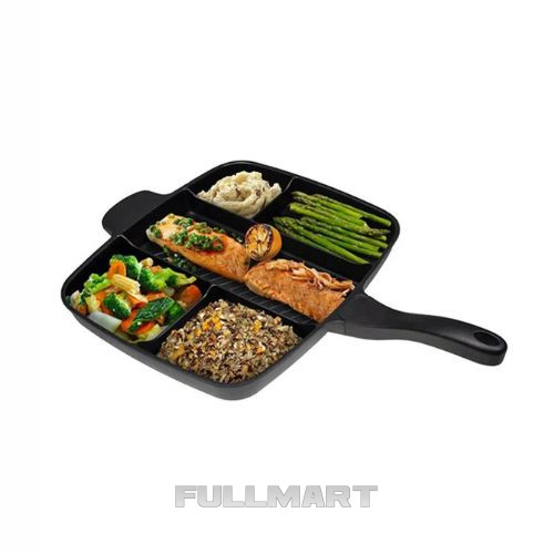 Сковорода Magic Pan Сковорода поділена на п'ять секцій. На ній можна готувати одразу п'ять страв або п'ять різних компонентів для інших страв. Висновок з цього робиться таким - час приготування може бути скорочений уп'ятеро. І миті після приготування доведеться не п'ять сковорідок, а лише одну. Що також заощаджує сили кулінара, засіб для миття посуду та води. Все швидко та легко! Сковорода виготовлена з литого алюмінію з антипригарним покриттям (не містить шкідливих добавок), зі знімною ручкою, можна мити в посудомийній машині. Підходити для всіх видів плит, крім індукції. Багатосекційна сковорода має п'ять відділень, загальна жаряча поверхня яких: 38 см, 30 см, 3 см. Ручка завдовжки 20 см. Центральне відділення сковороди прогрівається на 15-20% сильніше для приготування м'яса на грилі. Бакелітова ручка завдовжки 20 см. Енергозберігаюча основа The Master Pan із 100% литого алюмінію дозволяє рівномірно прогріватися. Антипригарне тефлонове покриття та подвійна куля Whitford's Xylan роблять її легкою в миття навіть у посудомийній машині та стійкою до плям.