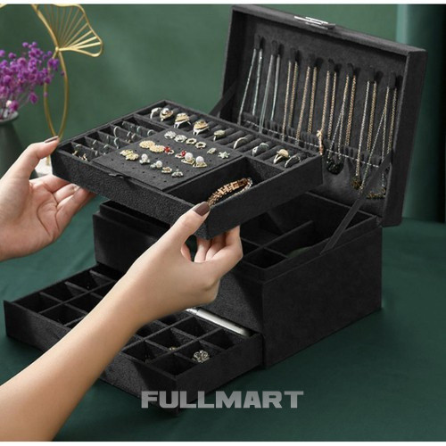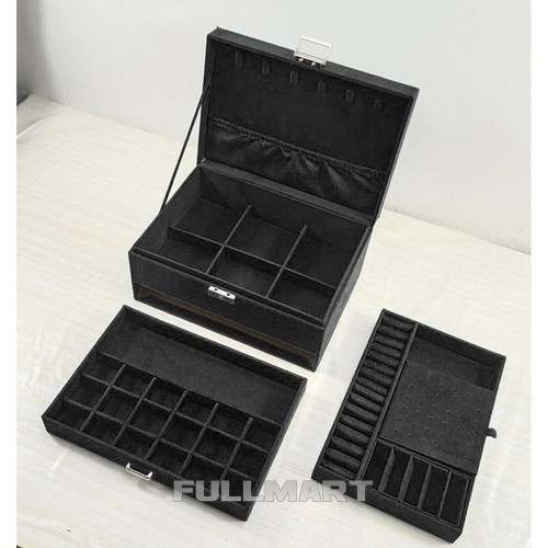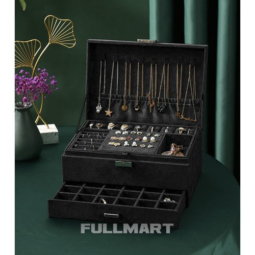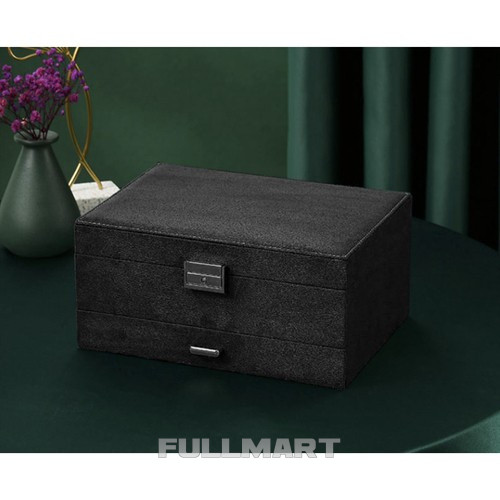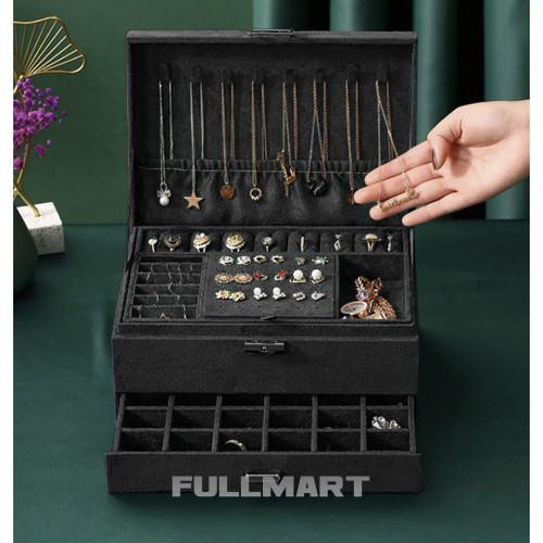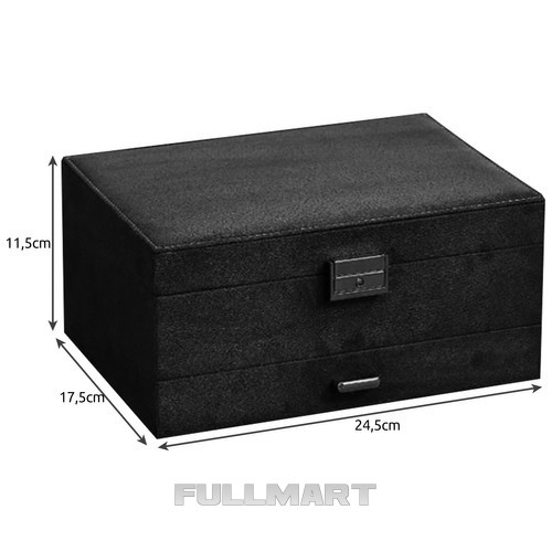 - СПЕЦИФІКАЦІЯ – матеріал: замша; конструкція: плита МДФ, флізелін; інше: папір, картон, пінопласт, нейлон; металеві елементи; колір: чорний; 8 ланцюгових вішалок; 15 слотів для кілець; 6 вузьких відділень; 1 кишеня на резинці; 18 місць для сережок-пусетів; 9 відділень для підвісок; 6 великих відділень; 18 відділень у ящику; 1 довгасте відділення для годинника; розміри закритого корпусу (довжина/ширина/висота): 11,5 х 24,5 х 17,5 см; вага: 0,94 кг. вага упаковки: 1,168 кг.