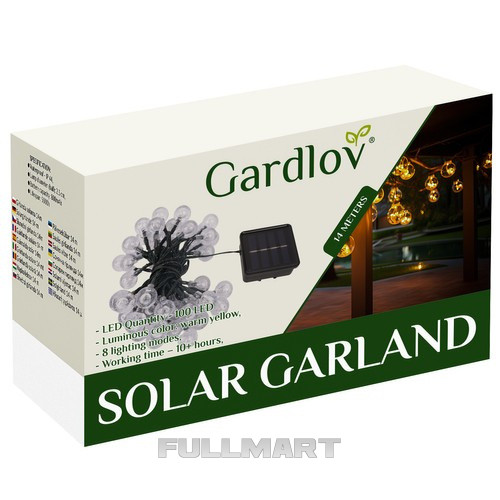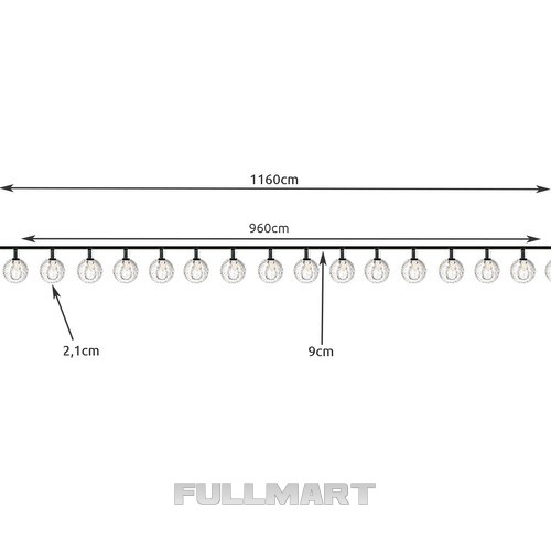 - СПЕЦИФИКАЦИЯ: материал: ПС, АБС, ПВХ, силикон; цвет: теплый белый; количество режимов освещения: 8; расстояние между шариками: 9 см; солнечная панель: 3В 800мАч; аккумулятор емкостью 800 мАч; водонепроницаемый: IP44; количество шариков: 100; время зарядки/работы: 10 часов; общая длина: 1160 см; длина кабеля с подсветкой: 960 см; диаметр шара: 2,1 см; вес: 0,830 кг; вес в упаковке: 0,9 кг